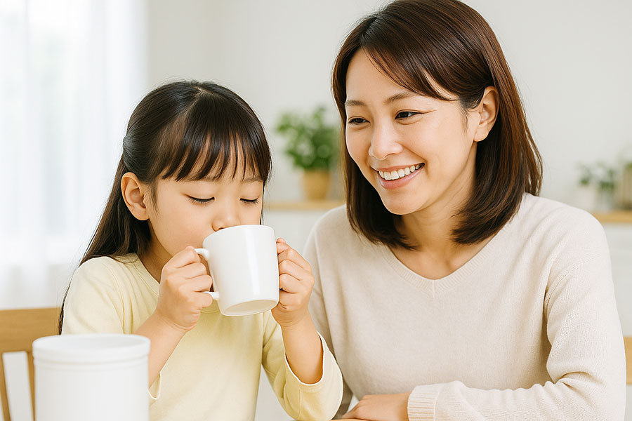 「今日はメロン味で冷たいミルク」「週末はココア味でホットドリンク」など、ちょっとした“お楽しみタイム”にすると、子どもも続けやすくなります。