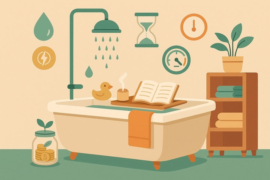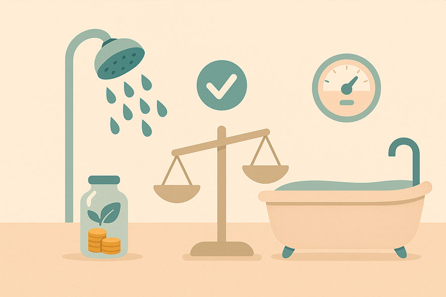 平日は8〜12分のショートシャワー、週末は湯船10〜15分のハイブリッド運用。